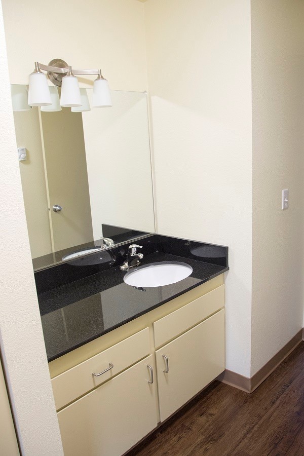 This is our one bedroom with a multi-use den, at 840 square feet, located right on the golf course. This apartment has granite countertops with black on black appliances. There is a full sized closet and wall-sized window, as well as a cable outlet in the den, which ensures freedom and versatility to use the space any way you choose. There is a full size washer and dryer and the bathroom is easily accessible from either the den or the master bedroom. Step onto your back patio to take in the lush landscaping with a golf course view.
