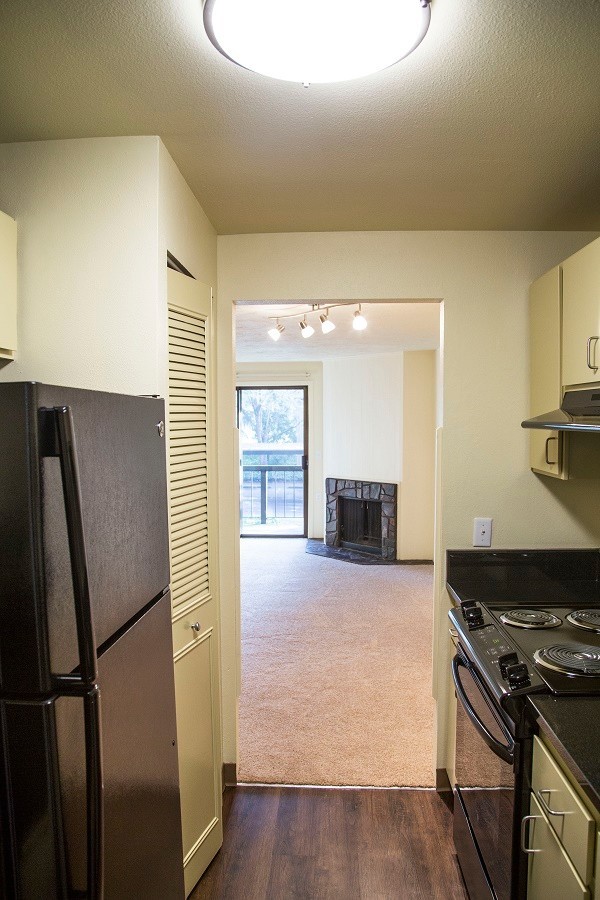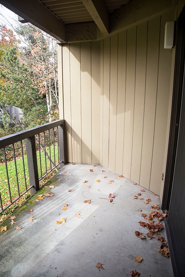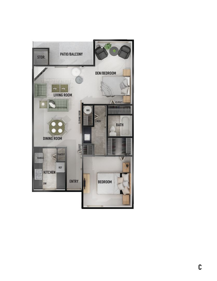 This is our one bedroom with a multi-use den, at 840 square feet, located right on the golf course. This apartment has granite countertops with black on black appliances. There is a full sized closet and wall-sized window, as well as a cable outlet in the den, which ensures freedom and versatility to use the space any way you choose. There is a full size washer and dryer and the bathroom is easily accessible from either the den or the master bedroom. The full size kitchen has updated granite countertops. Step onto your back patio to take in the lush landscaping with a golf course view.
